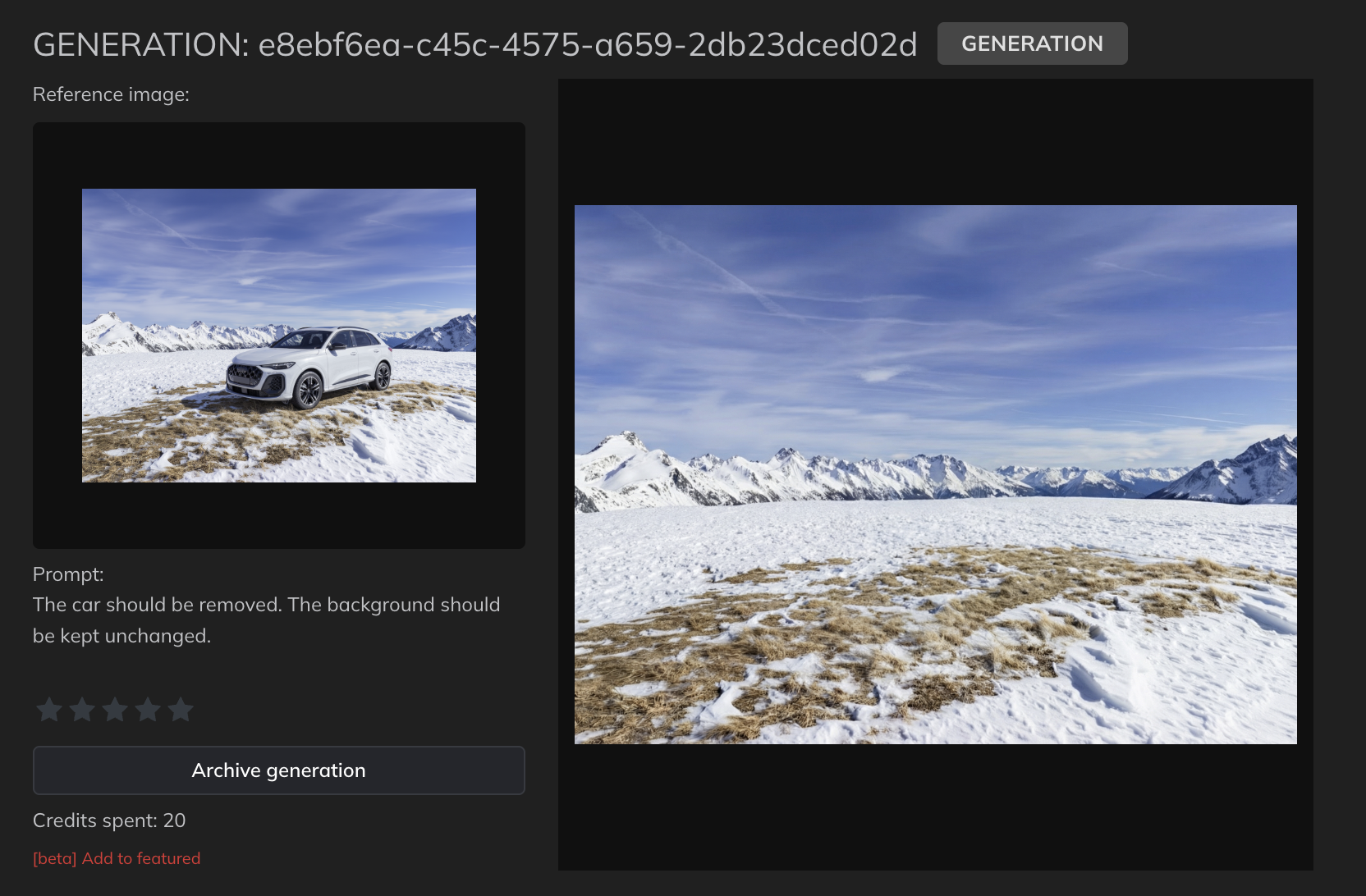 In the final production step, the AI placeholder car is replaced with a fully accurate CGI model of the Audi vehicle. This guarantees 100 percent product correctness while retaining the generated environment and lighting.