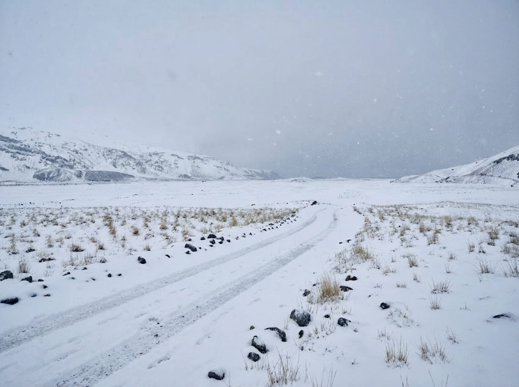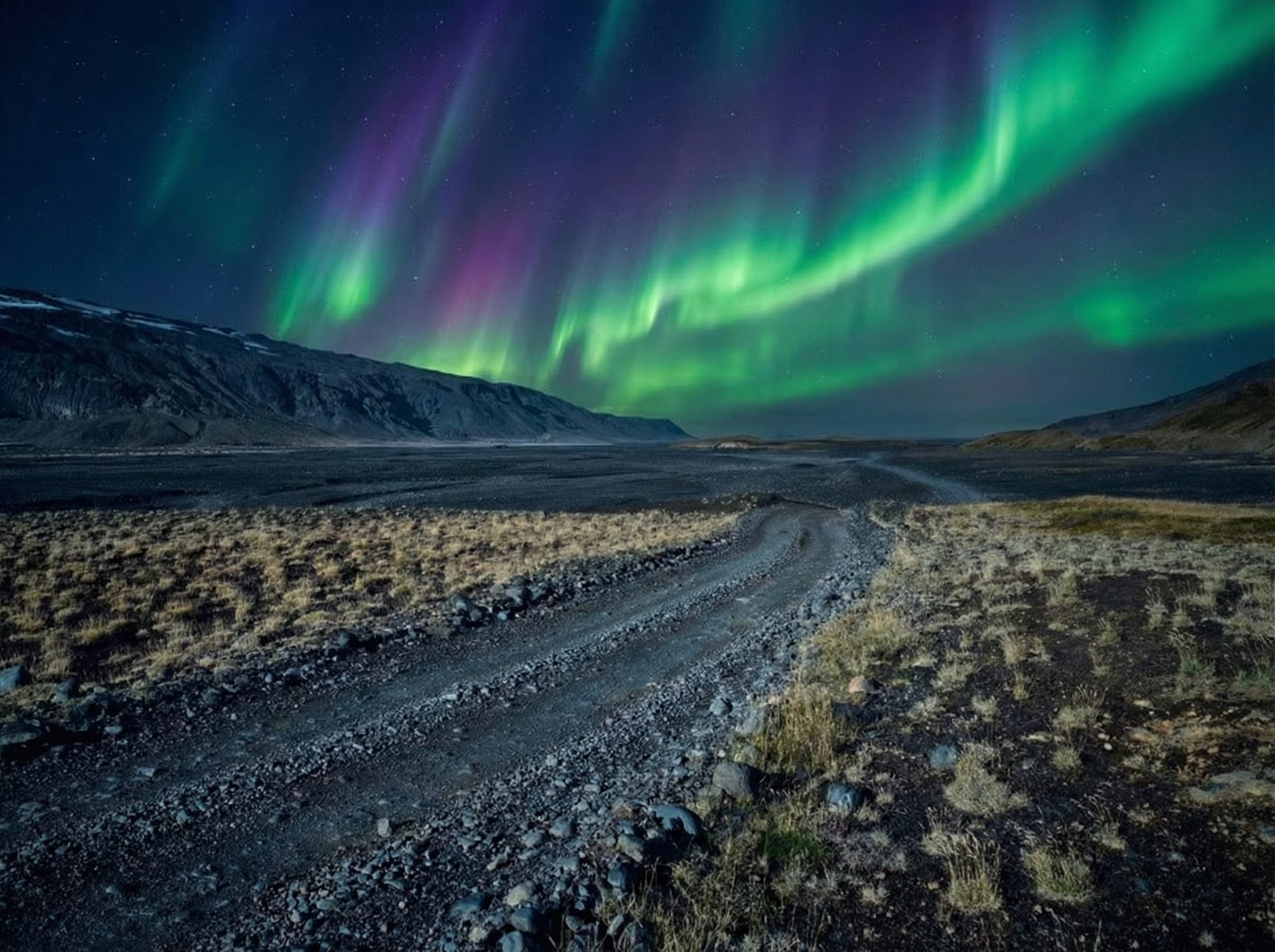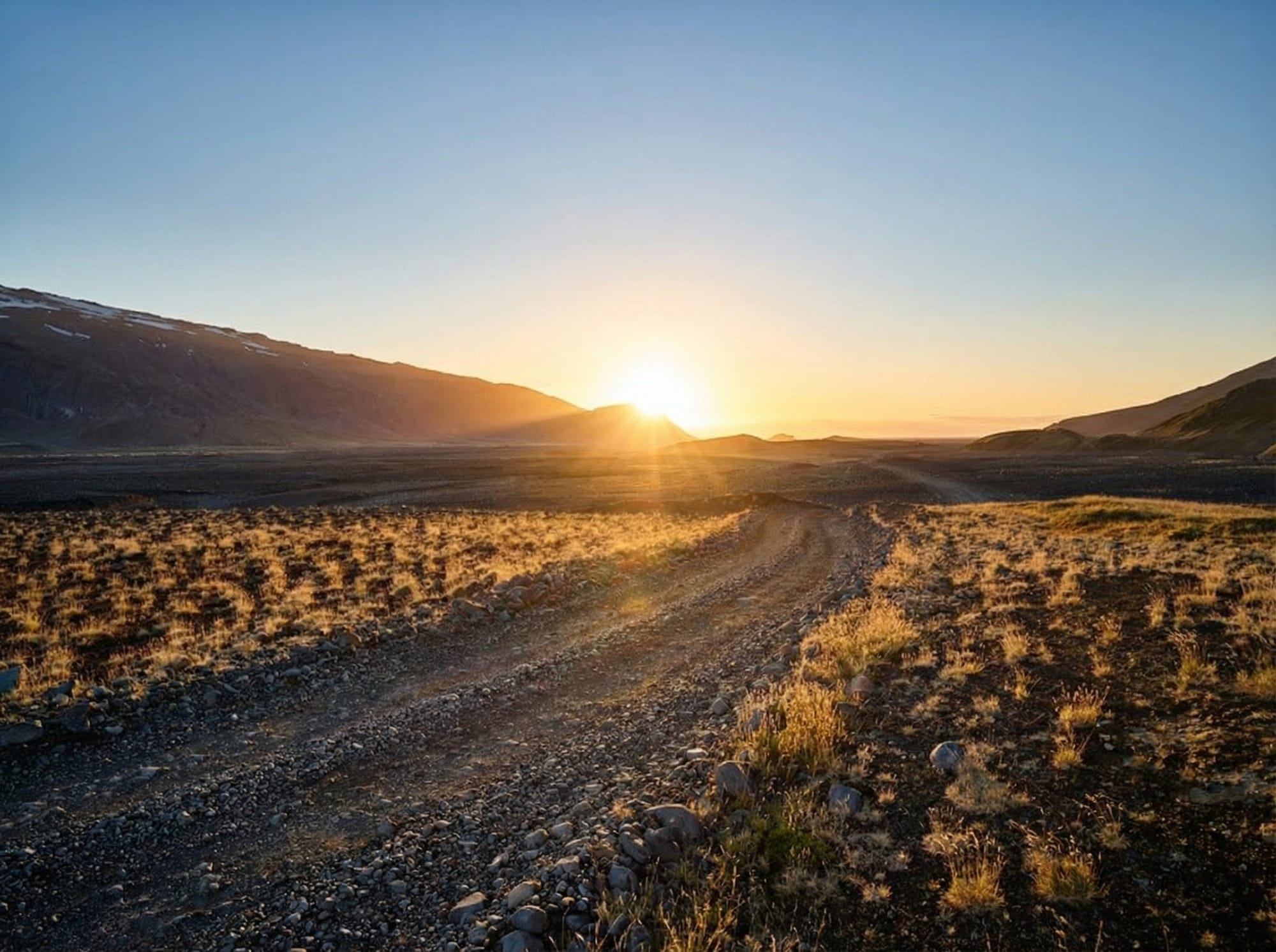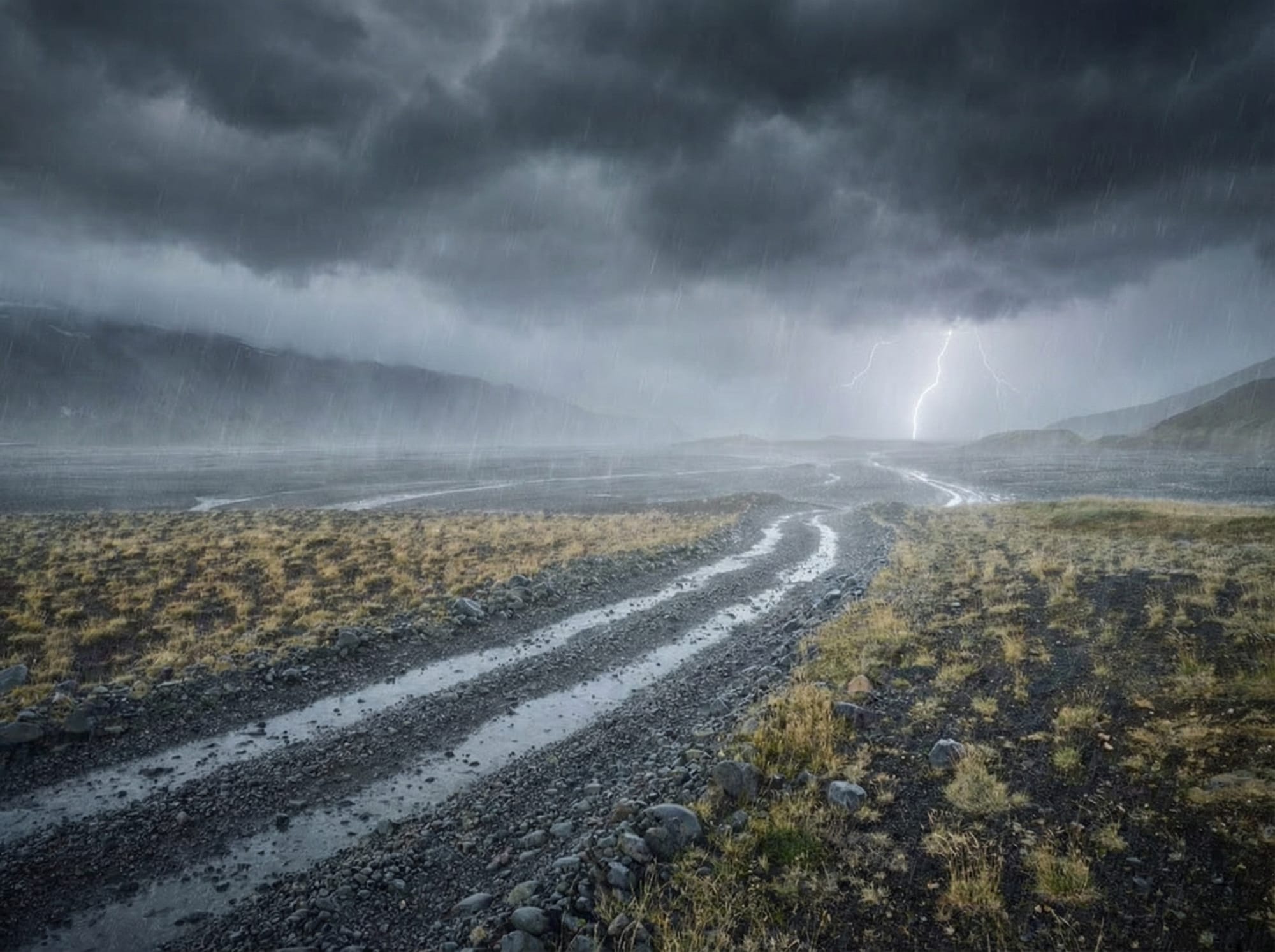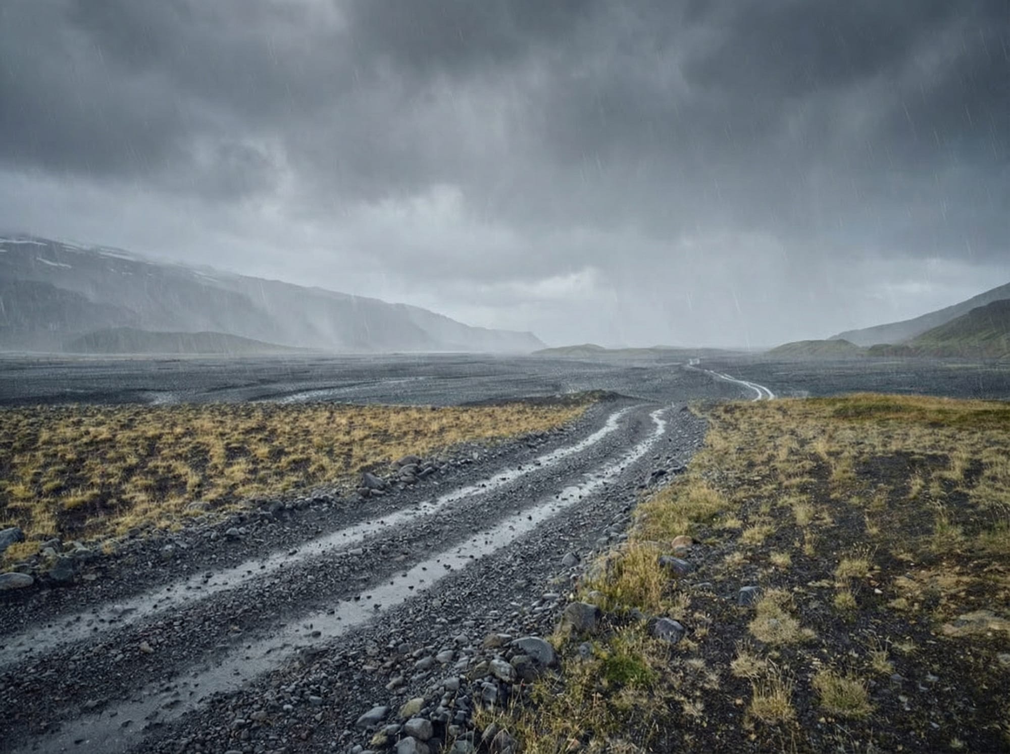 Take a location from the Iceland production: The original capture shows clear daylight with perfect visibility, with a wide view, a gravel path, and mountains in the background. With just a few clicks, the AI transforms the scenery: