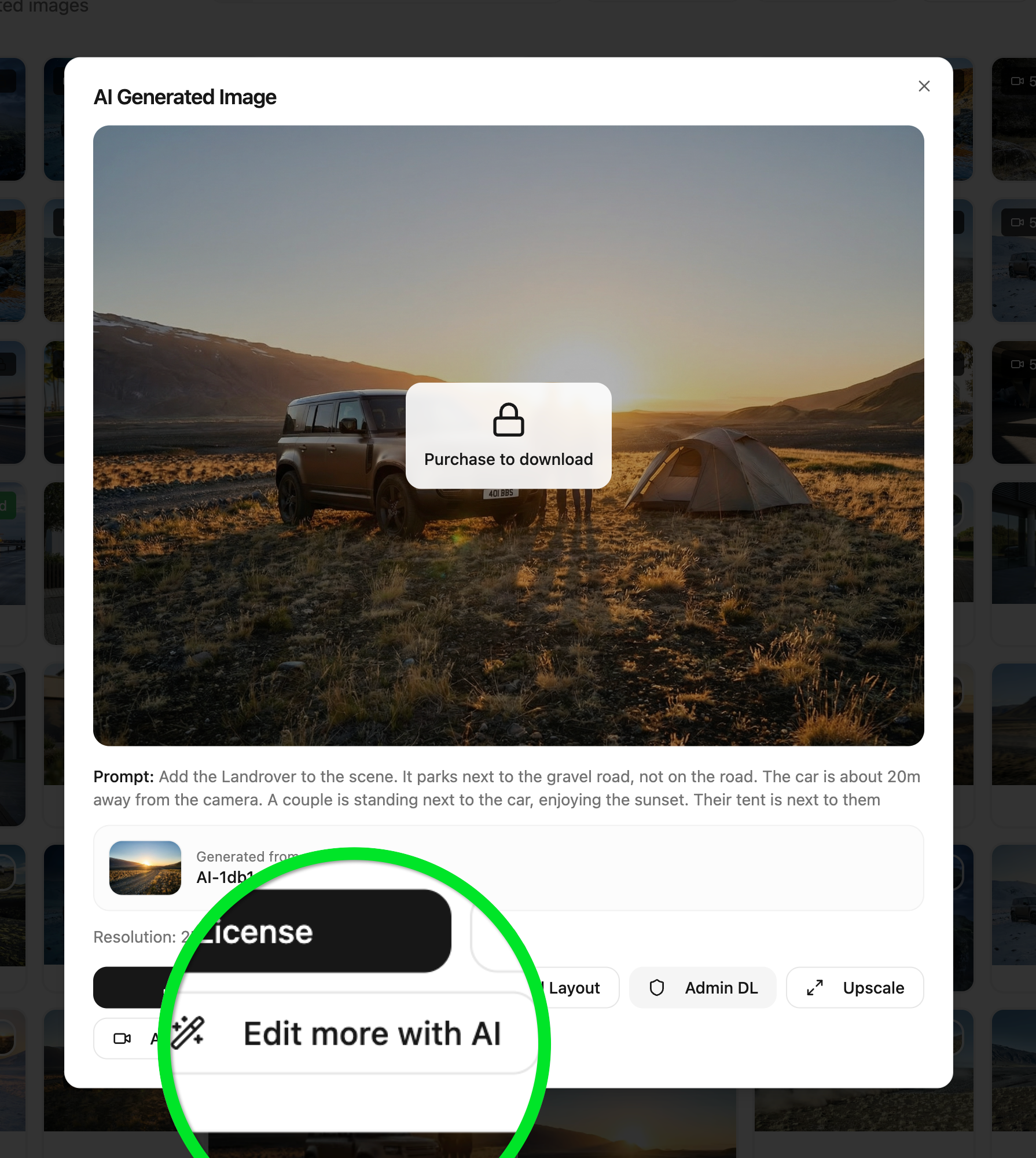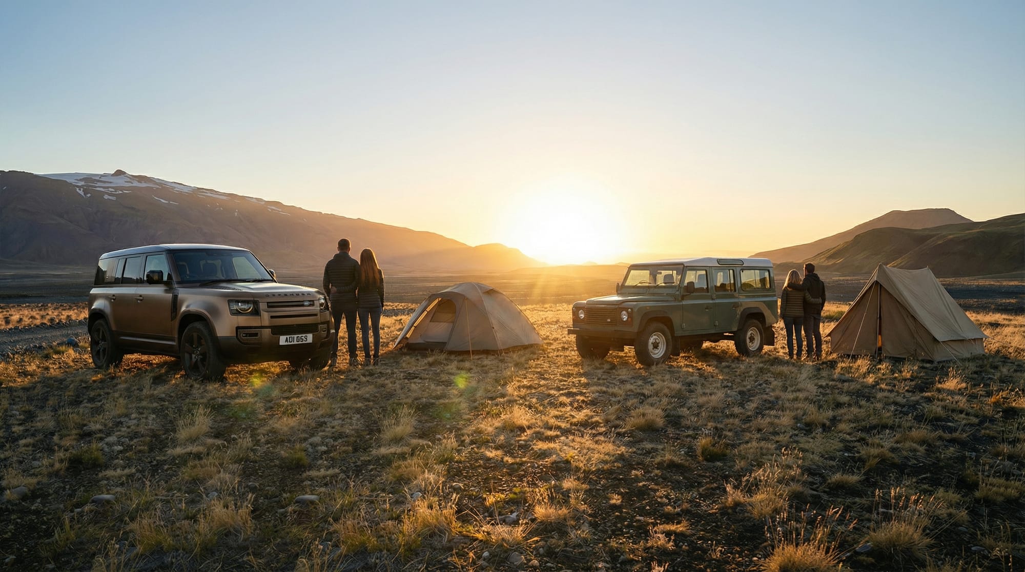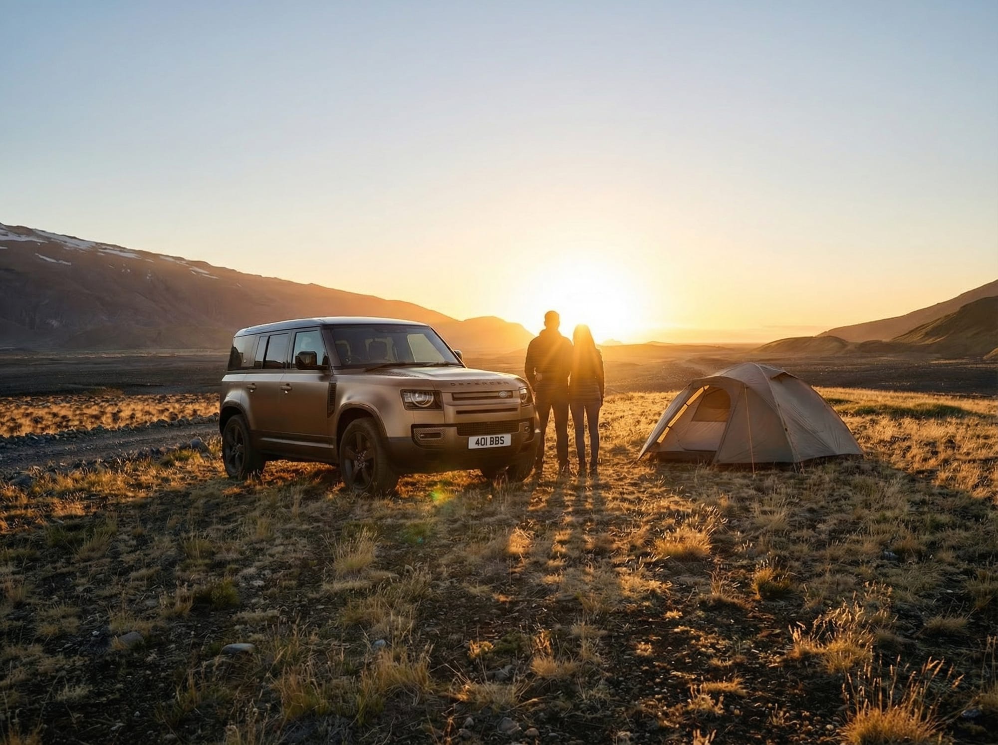 1. Prompt: "warm crystal-clear morning light. backlight, sun is rising" Add Car + 2. Prompt: "Add the Landrover to the scene. It parks next to the gravel road, not on the road. The car is about 20m away from the camera. A couple is standing next to the car, enjoying the sunset. Their tent is next to" them
