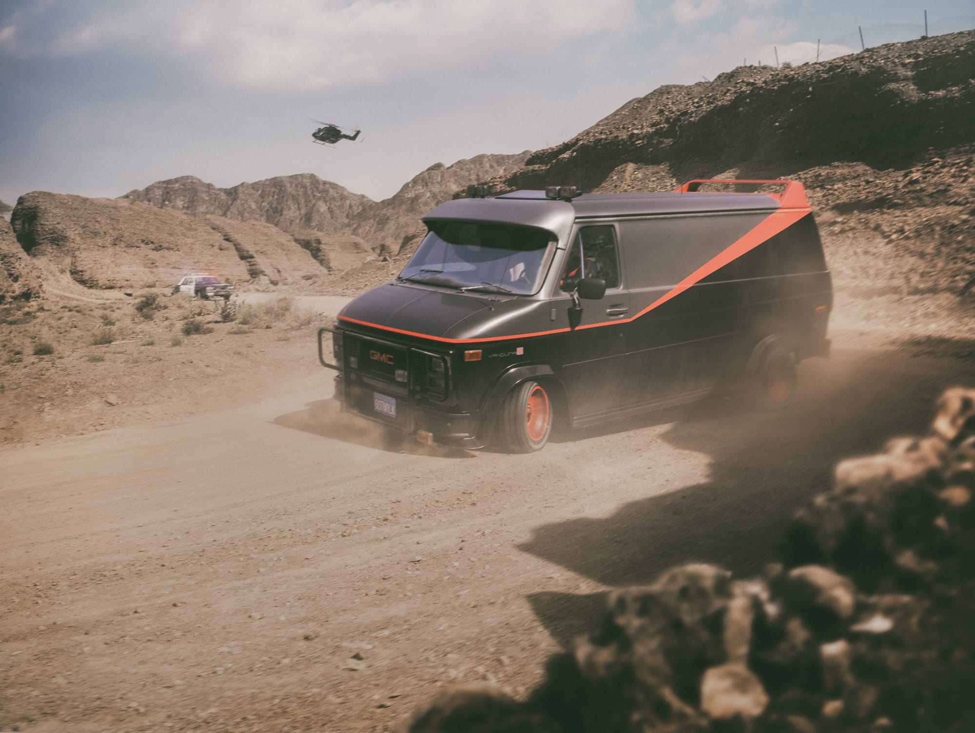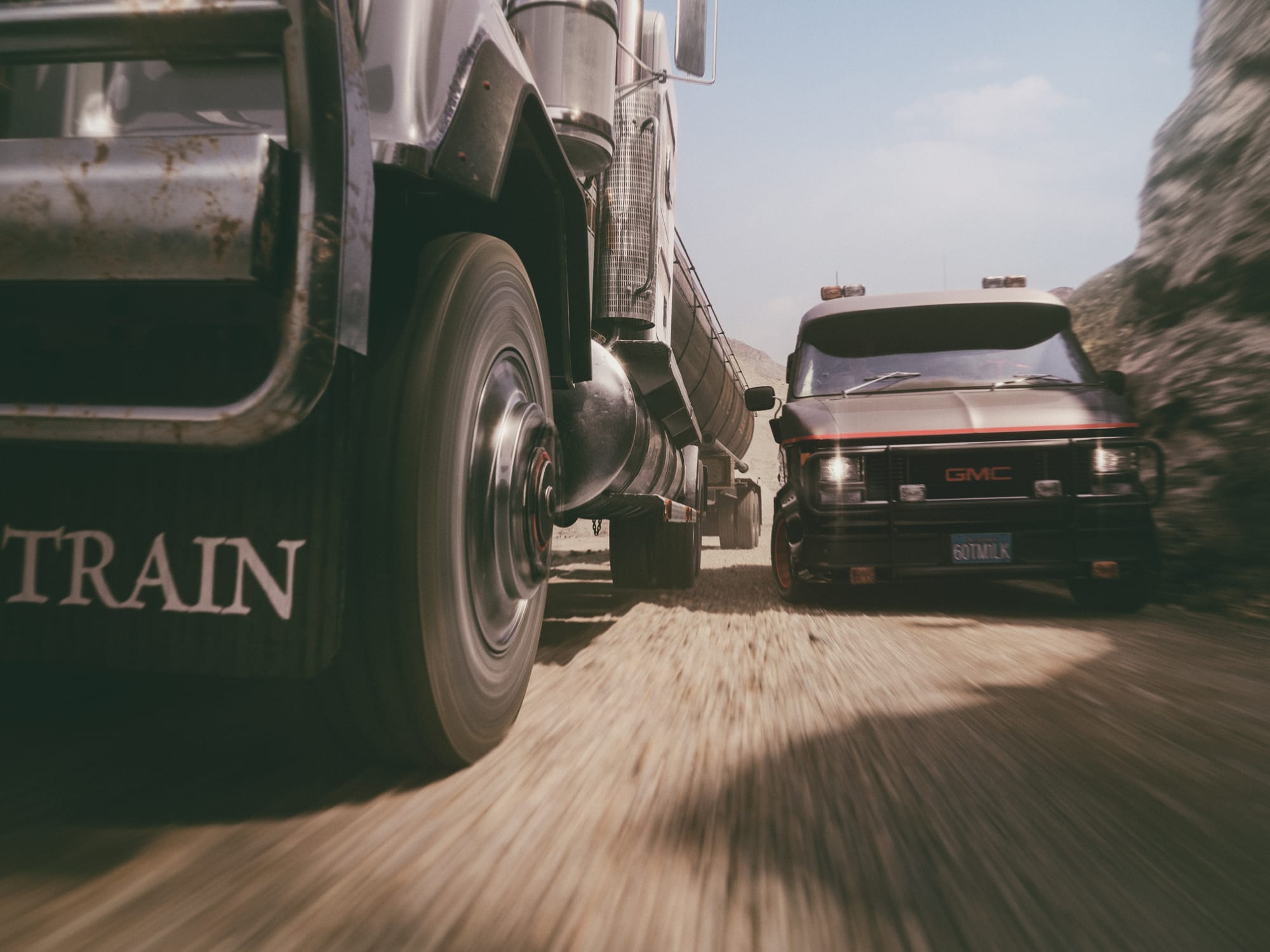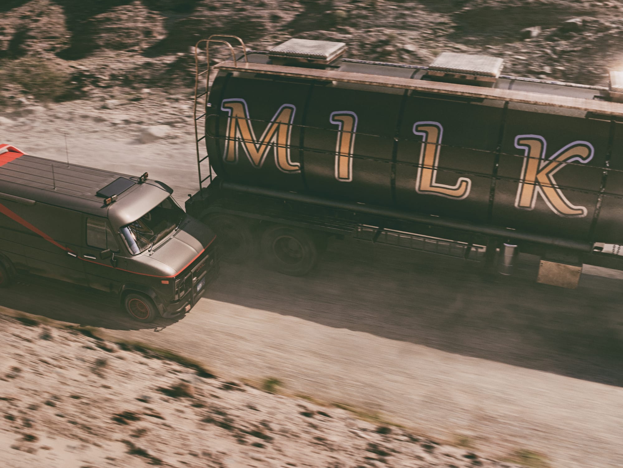 In their legendary GMC Van, the A-Team picks up the trail of a bunch of villains in a (supposed) milk truck. Then, suddenly, as it is fitting, the police are on their heels and a dynamic hunt ensues between the protagonists. The dry landscape under the hot Californian sun serves as the perfect backdrop for this action-packed spectacle, far from the big cities and in the midst of an endless wasteland.