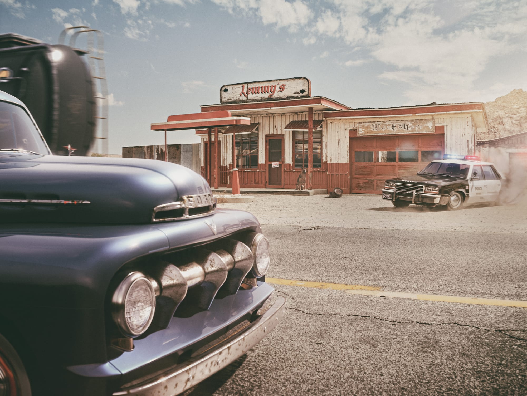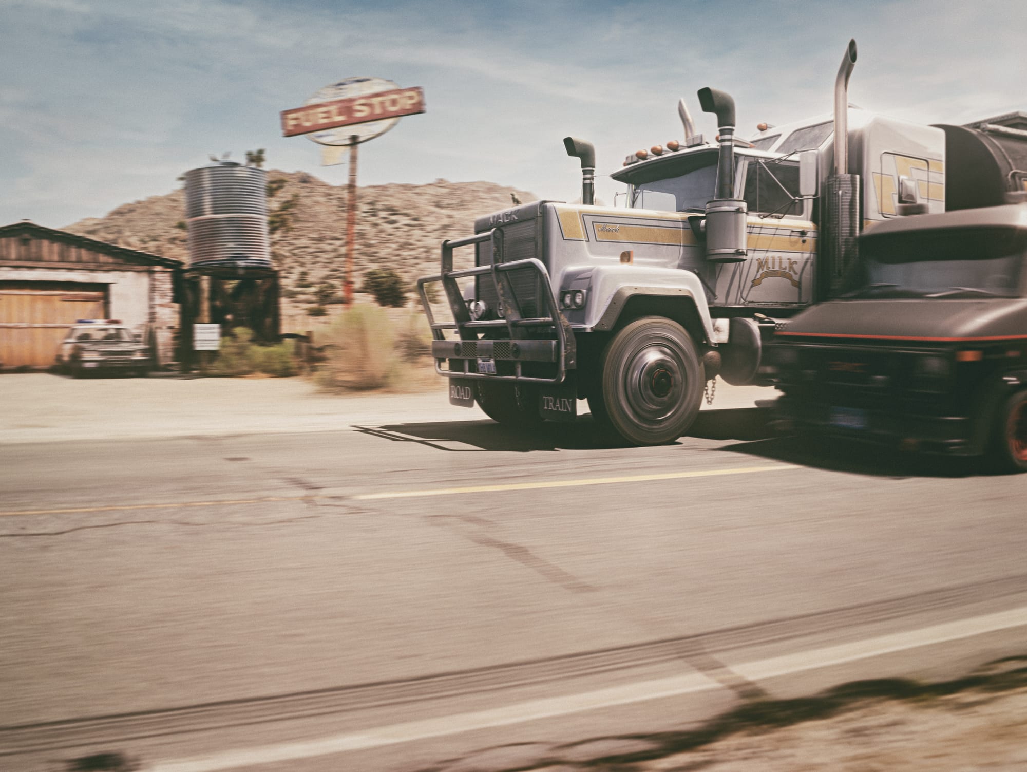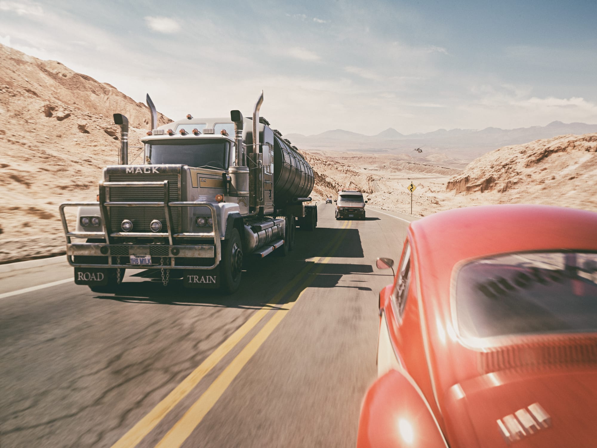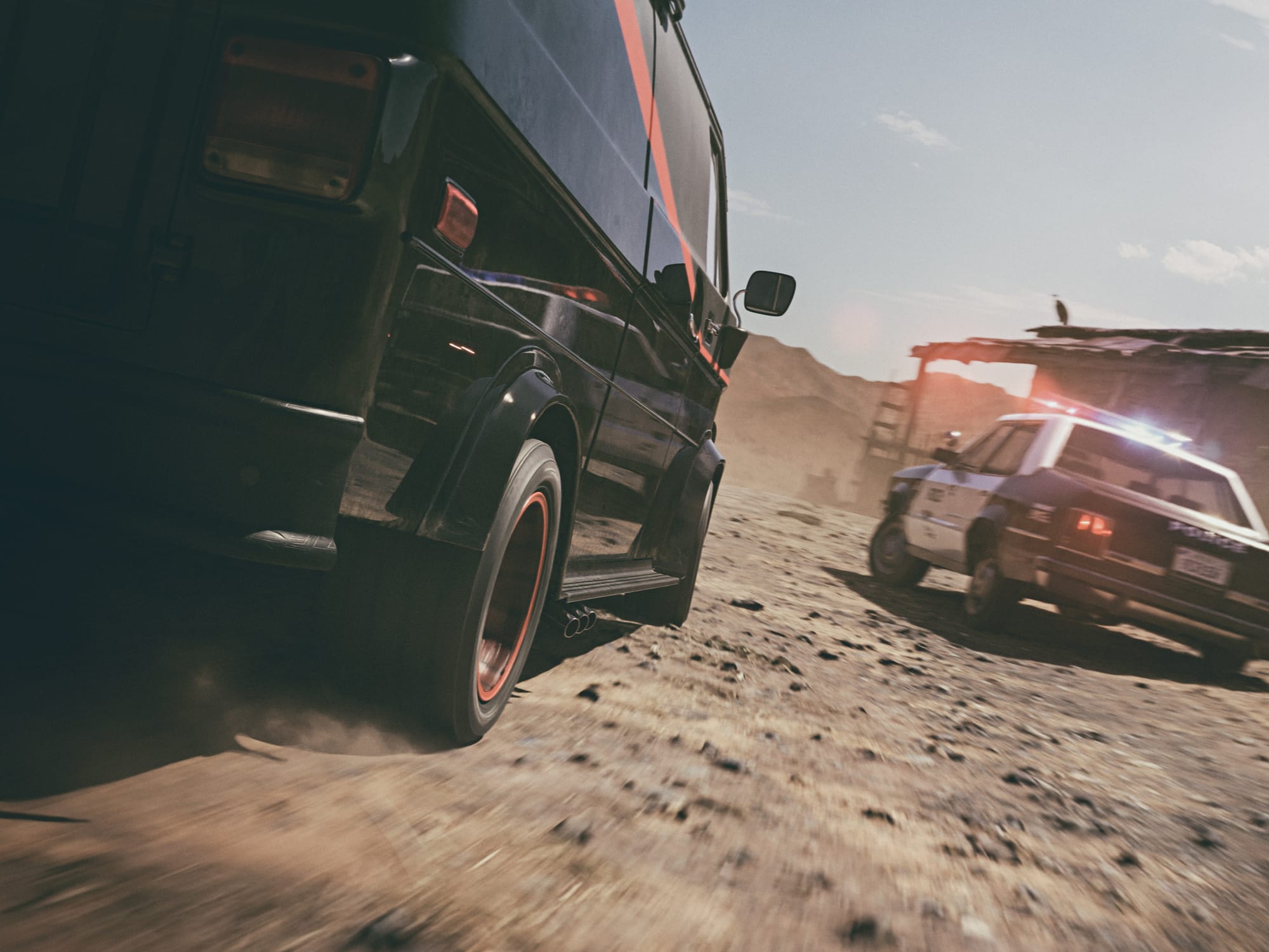 In their legendary GMC Van, the A-Team picks up the trail of a bunch of villains in a (supposed) milk truck. Then, suddenly, as it is fitting, the police are on their heels and a dynamic hunt ensues between the protagonists. The dry landscape under the hot Californian sun serves as the perfect backdrop for this action-packed spectacle, far from the big cities and in the midst of an endless wasteland.