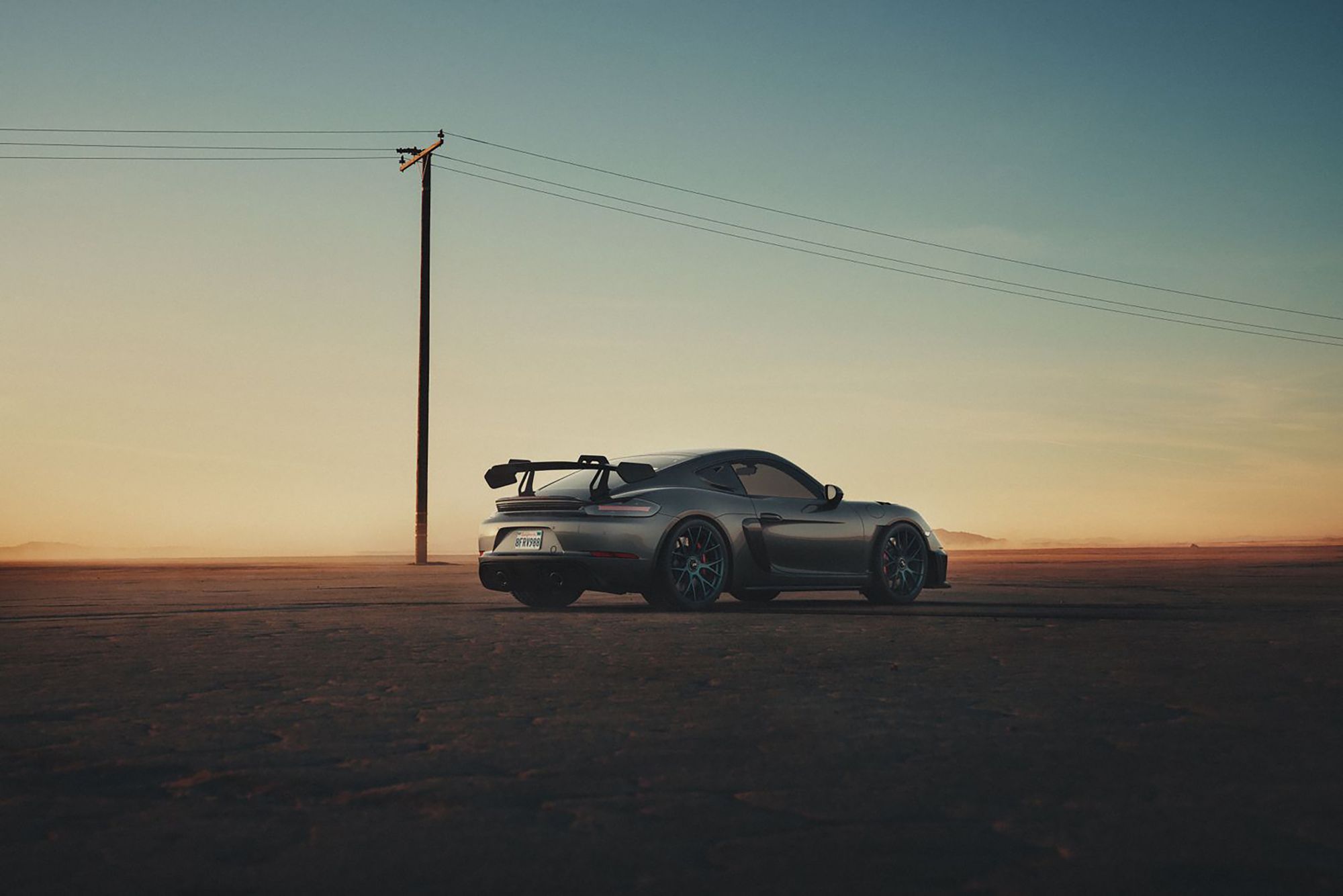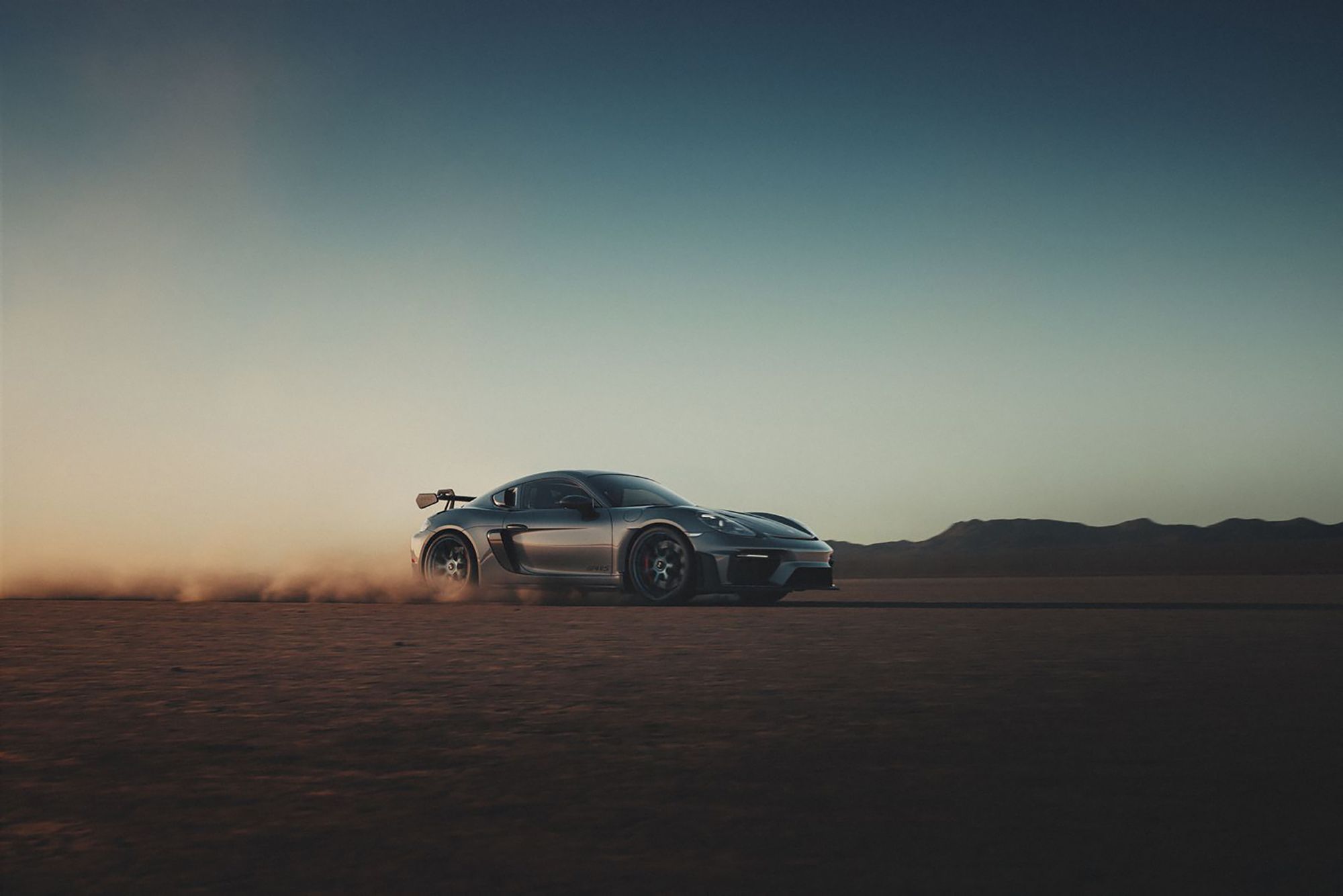 The Lake El Mirage desert, with its raw desert landscapes and ethereal beauty, provides the perfect background for showcasing the Porsche 718 Cayman GT4 RS.