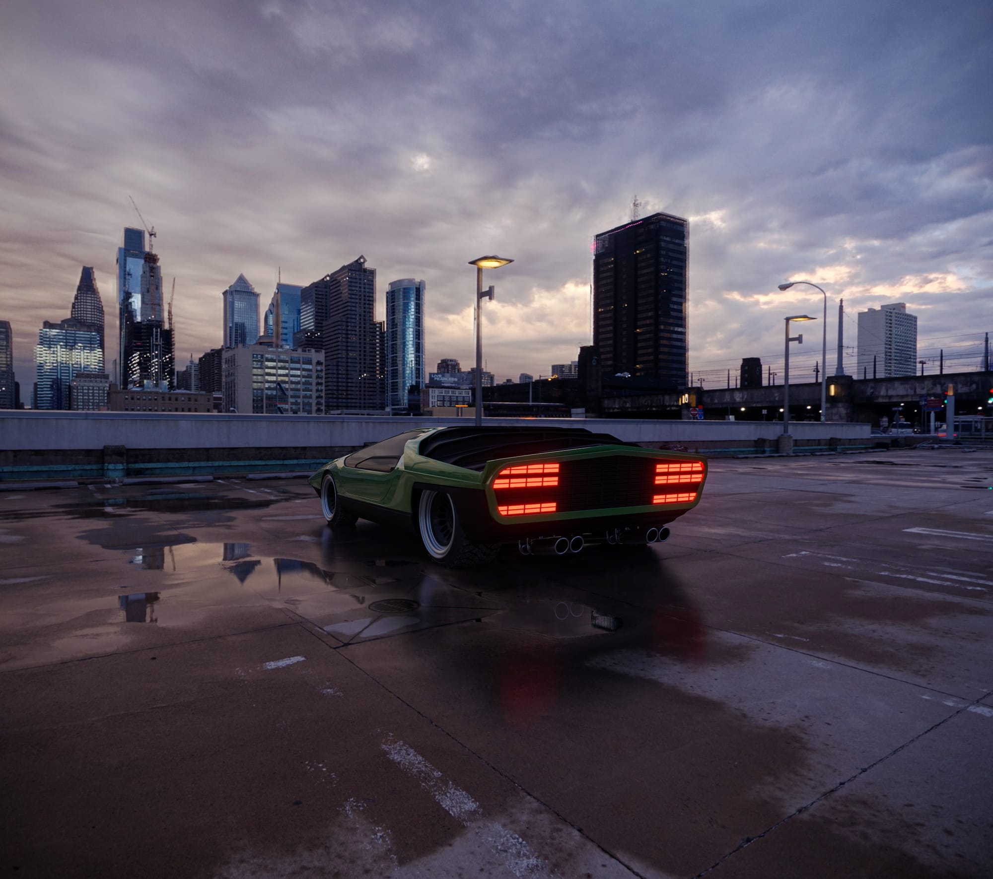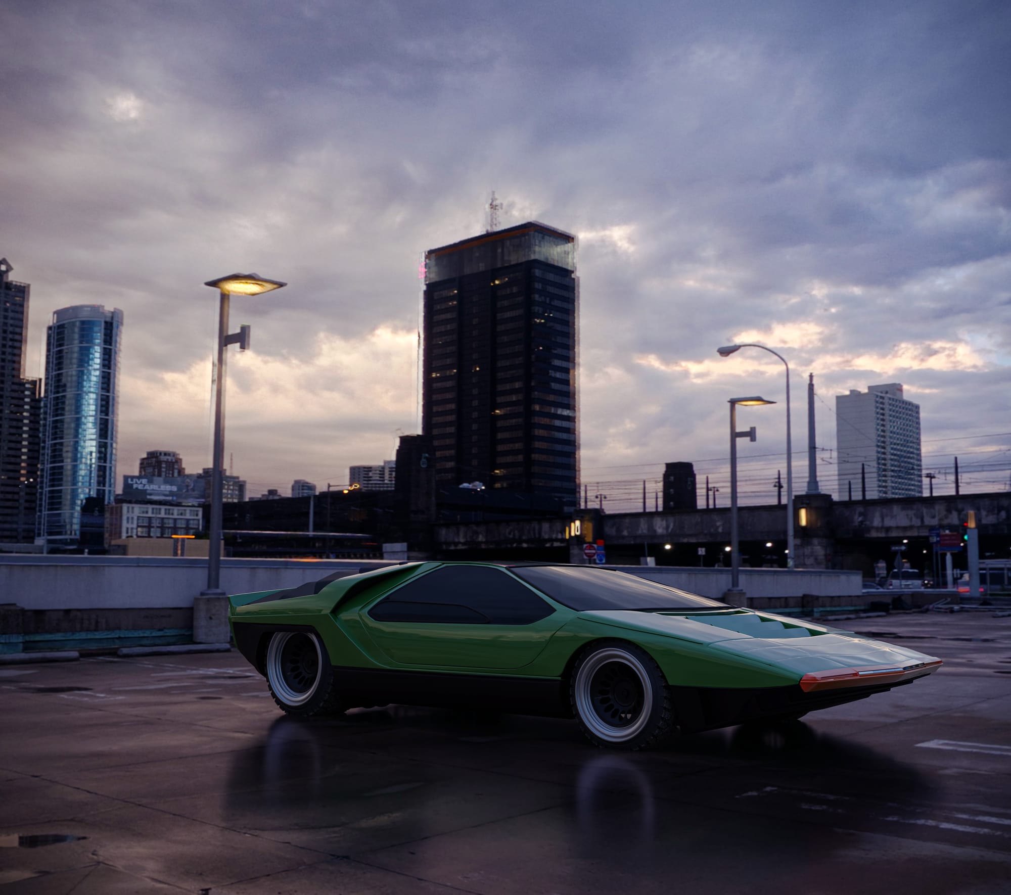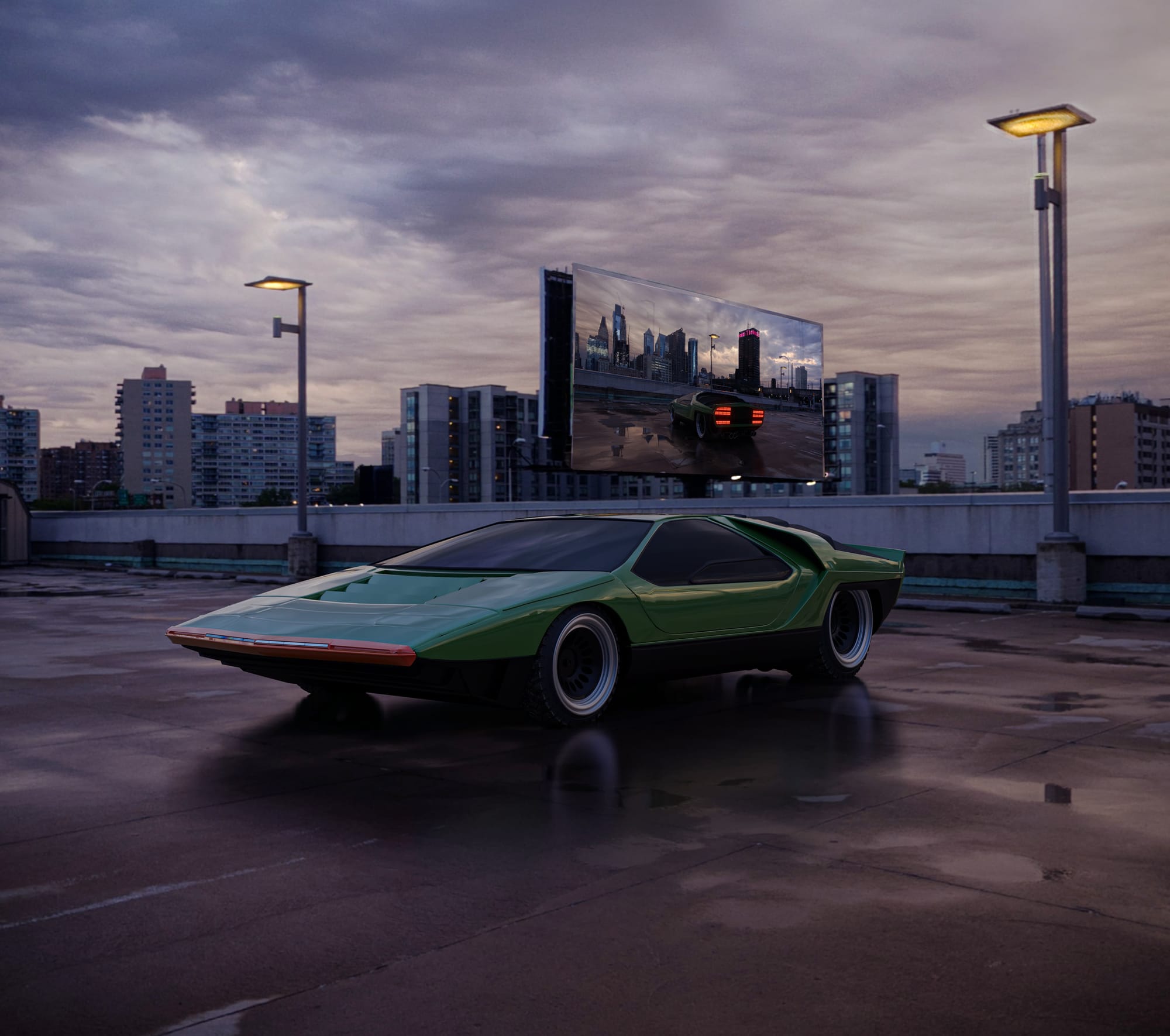 In this example, the Alfa Romeo Carabo, a design icon, is rendered within a single rooftop environment using a MAGROUND HDR dome. The dome plays a dual role in both lighting the scene and providing a visually rich background.